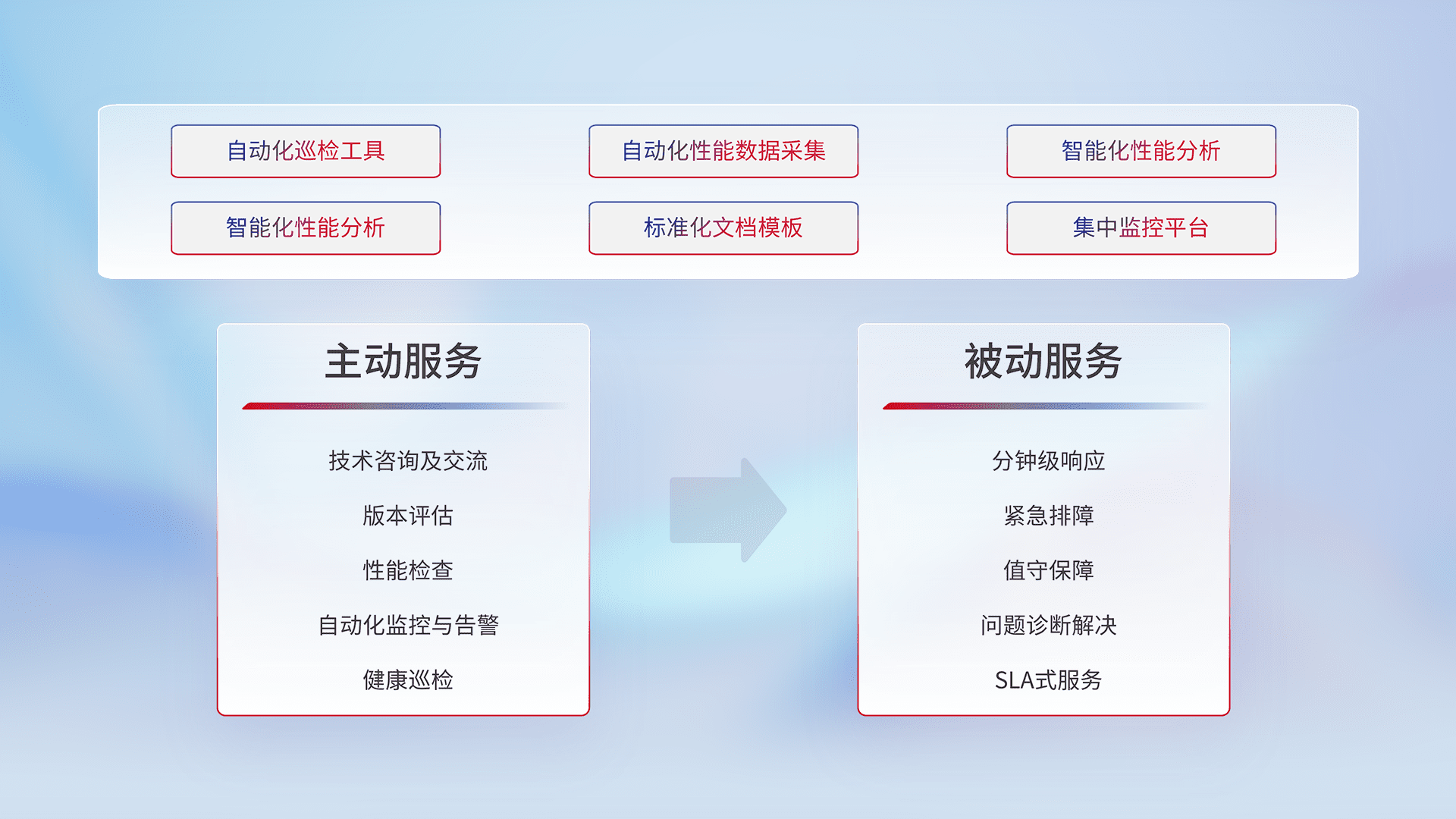 智能化工具和标准化文档,,,保障服务质量,,,提供主动服务(包含技术咨询、、、版本评估、、性能检查、、自动化监控与告警、、、、健康巡检)和被动服务包含(分钟级响应、、、紧急排障、、、值守保障、、、问题诊断解决、、、、SLA服务)。。。